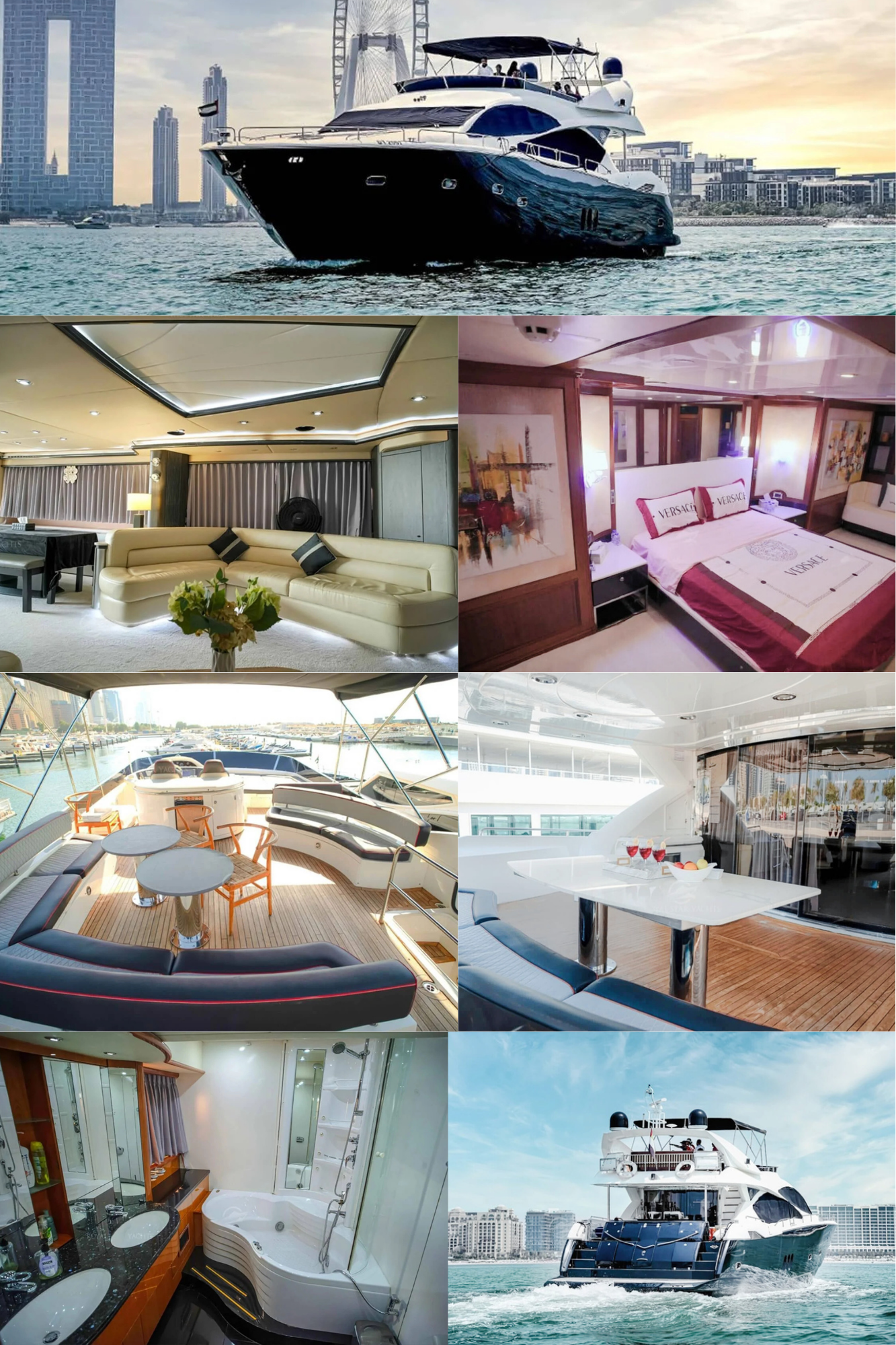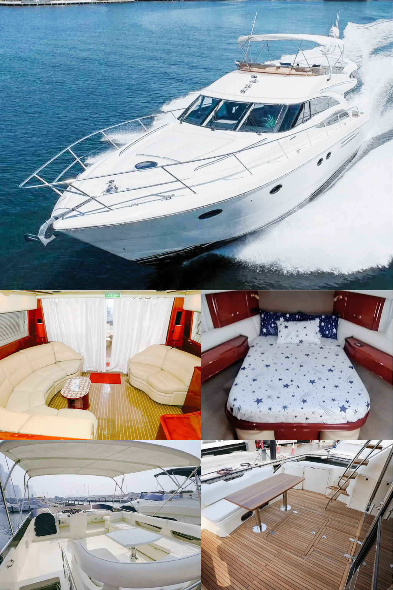 9Our company is pleased to offer you the Top brand Princess 60 Feet Luxury Air-conditioned double deck Yacht good for 20 Guest Capacity with a 3 bedrooms Spacious lounge, 2 washrooms, kitchen, satellite television with a music system as well. Our price is Aed 899 per Hour only. Our offer includes water, soft drinks and ice along with music system and a Fully Air-conditioned yacht and you are allowed to bring your own food and drinks in the yacht also.